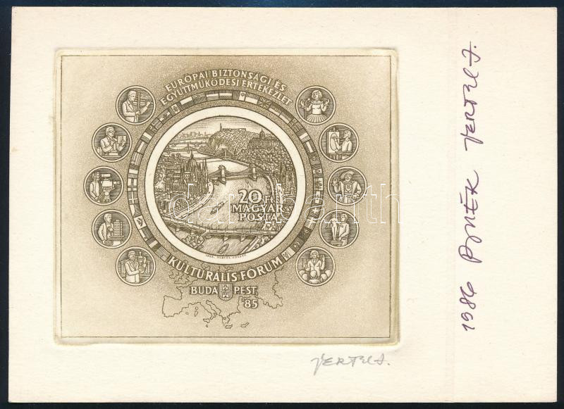 Leírás: 1986 1975 Vertel József (1922-1993): Budapesti Kulturális Fórum, rézkarc, papír, jelzett, 9,5×8 cm