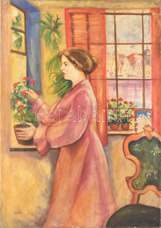 Csók I jelzéssel: Hölgy virágok közt. Olaj, vászon. 100×70,5 cm. https://www.darabanth.com/hu/438-Gyorsarveres/438.0/Festmenyek-es-grafikak/Festmenyek-es-grafikak-jelzessel-jelzes-nelkul~500002/Csok-I-jelzessel-Holgy-viragok-kozt-Olaj-vaszon-100C39770-5-cm~II2866240
