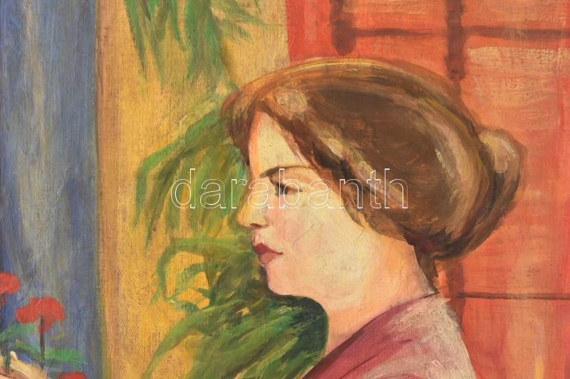 Leírás: Csók I jelzéssel: Hölgy virágok közt. Olaj, vászon. 100×70,5 cm.