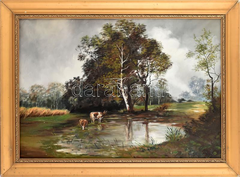 Leírás: Jelzés nélkül: Tehenek a vízparton. Olaj, vászon. Dekoratív fakeretben. 48×69,5 cm.