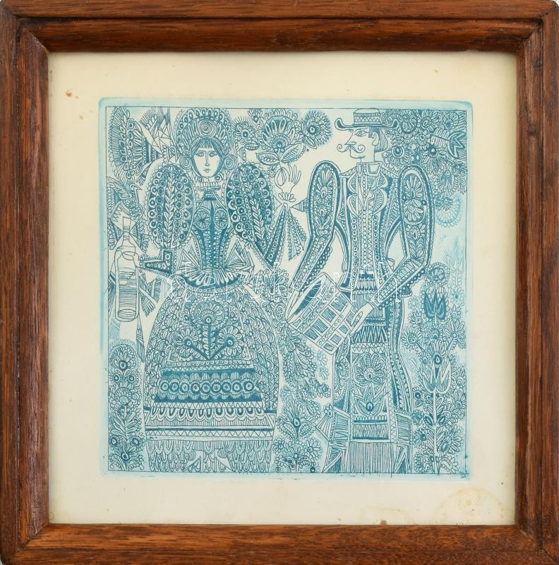 Leírás: Kass János (1927-2010): Alakok magyar népviseletben, rézkarc, papír, jelzés nélkül, minimális foltokkal, üvegezett fakeretben. 15×14,5 cm