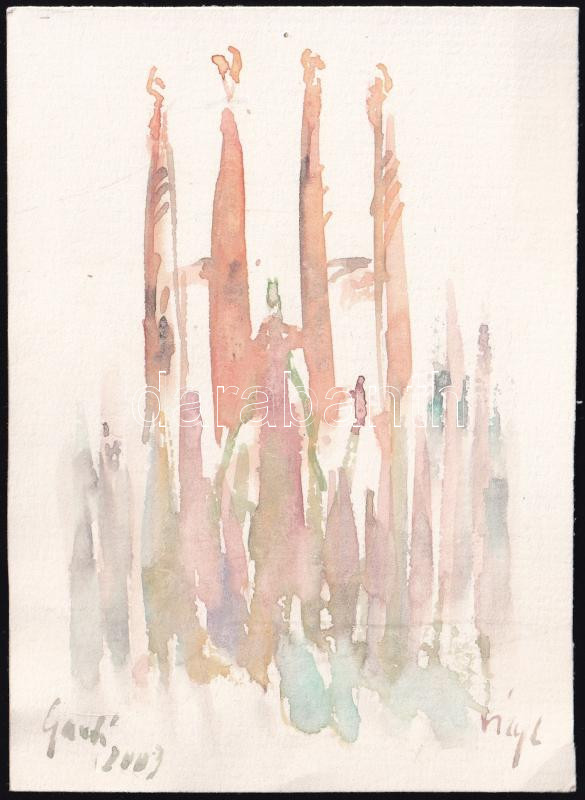 Vizy László (1943-): Barcelona, a Sagrada Família sziluettje, akvarell, papír, jelzett, a hátoldalon Vizy László újévi köszöntő soraival, aláírásával, 16x11 cm