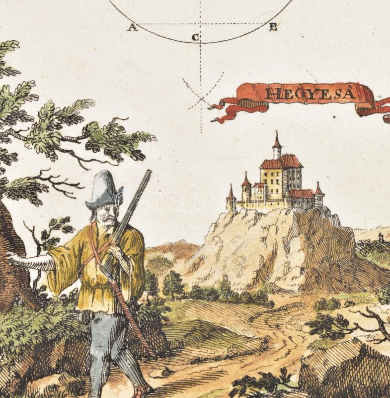 1731 Hegyes várának látképe. Szenezett rézmetszet megjelent: Birckenstein/Pürckenstein, Anthon Ernst Burckhard von: Auslesener Anfang zu denen höchst=nützlichen Matematischen Wissenschaften...Sammt einem Anhang oder Beschreibung, Derer...Ungarischen Städten... Augspurg, 1731, Mertz und Mayer. 100x160 mm