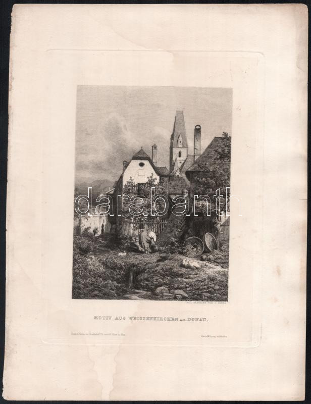 Carl Eduard Onken (1846-1934): Motiv aus Weissenkirchen a.d. Donau (Ausztria), 1880 körül. Rézkarc, papír, jelzett a karcon. Foltos. Lapszéli apró szakadással. 26x19,5 cm
