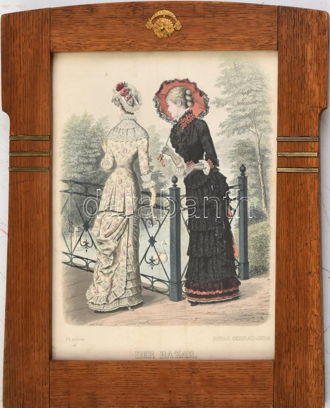 Leírás: Divatkép a Der Bazar c. magazinból, Pl. XXVIII. Rotációs fametszet, papír. Dekoratív, üvegezett fakeretben, 27×20,5 cm