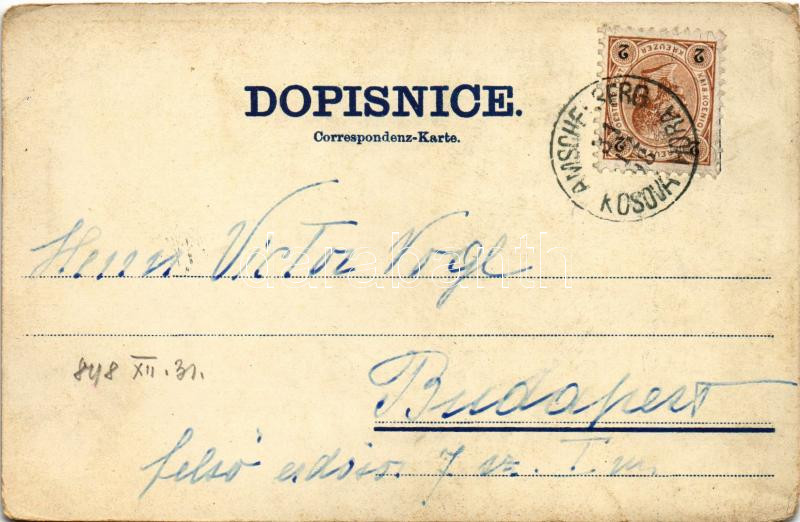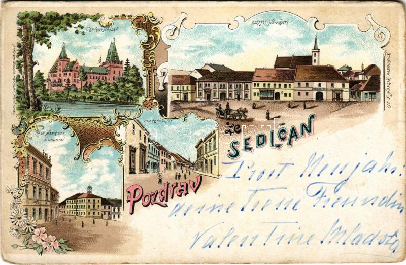Leírás: 1898 (Vorläufer) Sedlcany, Cerveny hradek, Dolejsi námesti, Cást námesti s radnici, Prazská ulice / castle, square, town hall. Art Nouveau, floral, litho (worn corners)