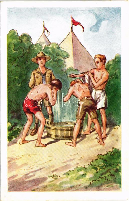 Leírás: Reggeli mosakodás. Cserkész művészlap. Rigler József Ede kiadása R.J.E. 8005. / Hungarian boy scout art postcard, scout camp, morning wash