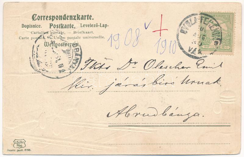 1900 Gyulafehérvár, Alba Iulia, Karlsburg; Üdvözlet Gyulafehérvárról! Vasúti kocsin utazó hölgy és úriember, vonat. Schäser F. szecessziós dombornyomott litho művészlap / Greetings from Alba Iulia! Gentleman and lady on a train. Art Nouveau, embossed, litho montage from the railway
