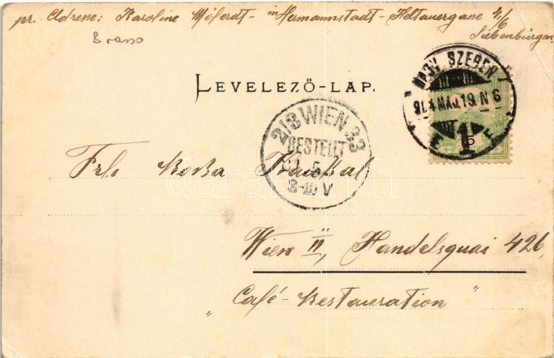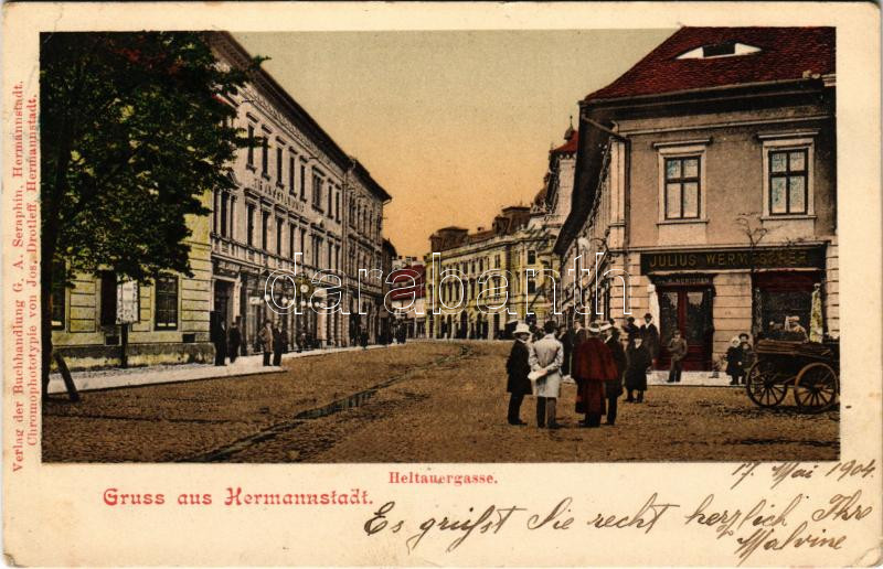 1904 Nagyszeben, Hermannstadt, Sibiu; Heltauergasse / Disznódi utca, Julius Wermescher üzlete, Hotel Transsylvania szálloda. G. A. Seraphin kiadása. Chromophototypie von Jos. Drotleff / street view, shops, hotel (EB)