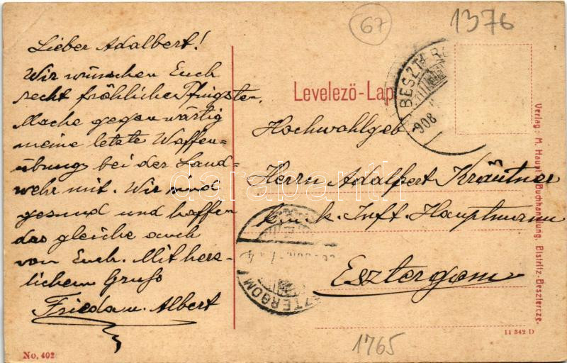 Leírás: 1908 Beszterce, Bistritz, Bistrita; Gewerbevereins-Gebäude / Ipartársulati épület. W.L. (?) No. 402. M. Haupt kiadása / House of Craftsmen Association (EB)
