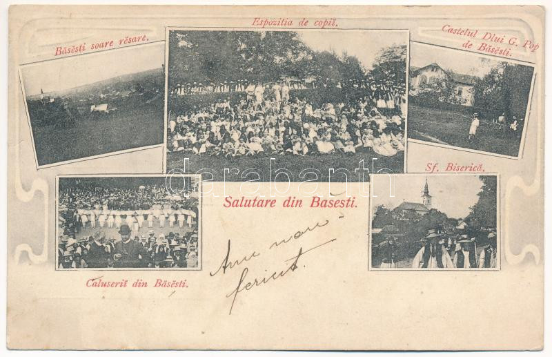 1909 Szilágyillésfalva, Illésfalva, Basesti (Máramaros); Espozitia de copii, Castelul Dlui G. Pop, Caluserii, Sf. Biserica / Gyermek előadás, kastély, Calusari népviselet, templom / children play, castle, folklore, church. Art Nouveau (EK)