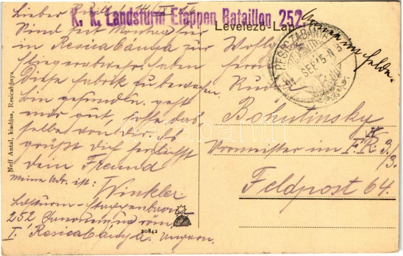 Leírás: 1916 Resicabánya, Resicza, Recita, Resita; Vasgyár. Neff Antal kiadása / ironworks, iron factory + "K.k. Landsturm Etappen Bataillon 252" (EK)