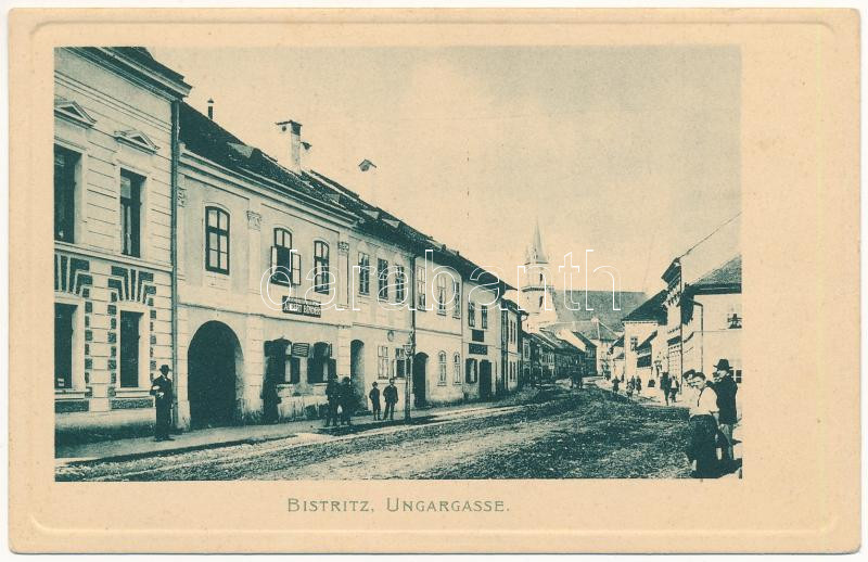 Leírás: Beszterce, Bistritz, Bistrita; Magyar utca, Albert Binder üzlete. Theodor Botschar kiadása / Ungargasse / street, shops