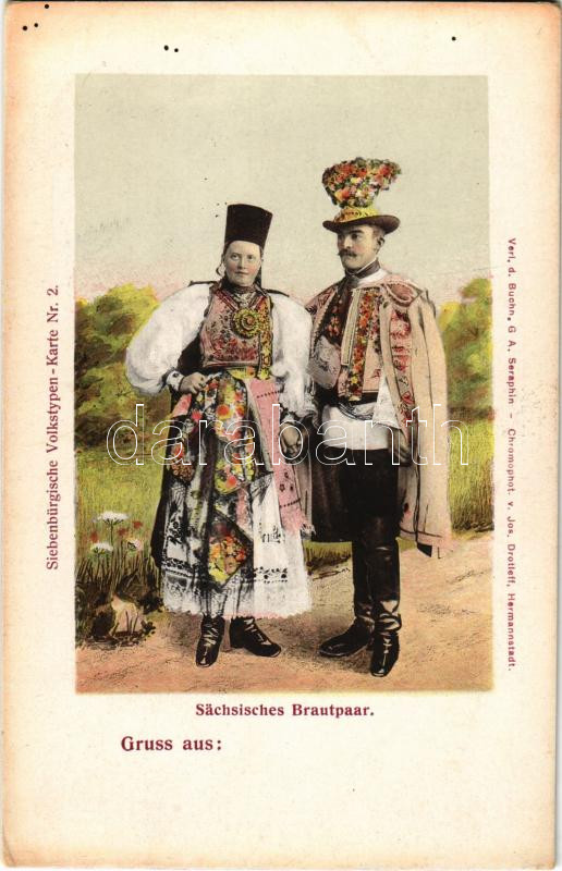Erdélyi szász házaspár / Sächsisches Brautpaar. Siebenbürgische Volkstypen Karte Nr. 2. G.A. Seraphin, Jos. Drotleff / Transylvanian Saxon folklore (fl)