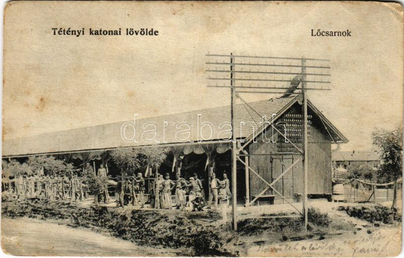 1908 Budapest XXII. Nagytétény, Tétényi katonai lövölde, Lőcsarnok katonákkal. M. T. és F. V. Koch és Pór kiadása / Austro-Hungarian K.u.K. military shooting hall with soldiers (EK)