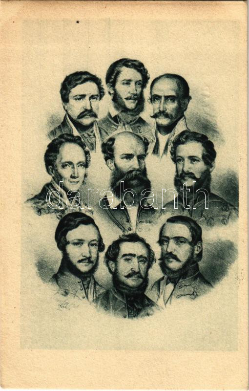 Az első magyar minisztérium. Magyarország első felelős kormánya (Batthyány-kormány): Báró Eötvös József, Szemere Bertalan, Hg. Esterházy Pál, Kossuth Lajos, Deák Ferenc, Gr. Széchenyi István, Gr. Batthyány Lajos, Klauzál Gábor, Mészáros Lázár. Komlós "Negyvennyolc" sorozat I. 6. / The First Government of Hungary