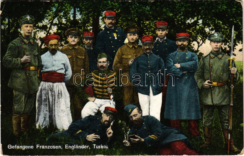 Gefangene Franzosen, Engländer, Turko. Kriegsgefangene No. 23. / Első világháborús francia, angol és török hadifogoly katonák német katonákkal / WWI German military, French, British and Turkish POWs (prisoner of war) (EK)
