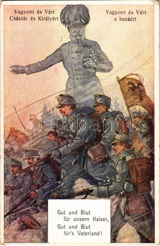 Gut und Blut für unsern Kaiser, Gut und Blut für's Vaterland! / Vagyont és vért a Császár és Királyért, vagyont és vért a Hazáért / WWI Austro-Hungarian K.u.K. military art postcard, patriotic propaganda with Franz Joseph I of Austria. B.K.W.I. 259-107. (EK)