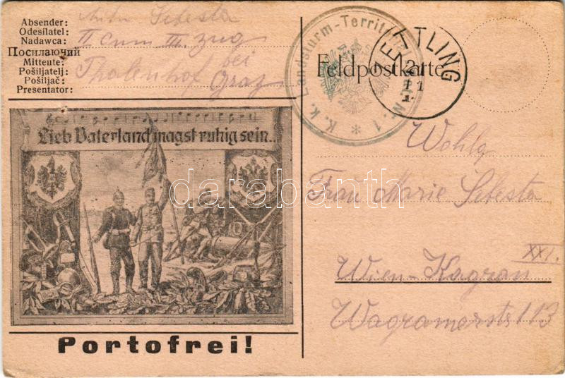 Leírás: Lieb Vaterland magst ruhig sein... Feldpostkarte / WWI German and Austro-Hungarian K.u.K. military field postcard, Viribus Unitis propaganda + "K.k. Landsturm-Territorial-Bat. Nr. 1." (lyukak / pinholes)