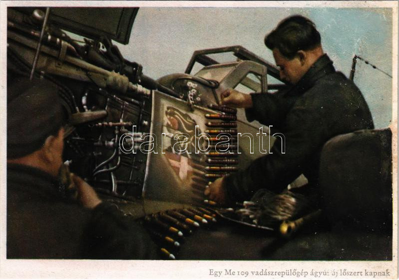 Második világháborús német katonai lap. Egy német Me 109 vadászrepülőgép ágyúi új lőszert kapnak. C. Berger haditudósító felvétele. Carl Werner / WWII German military aircraft (r)