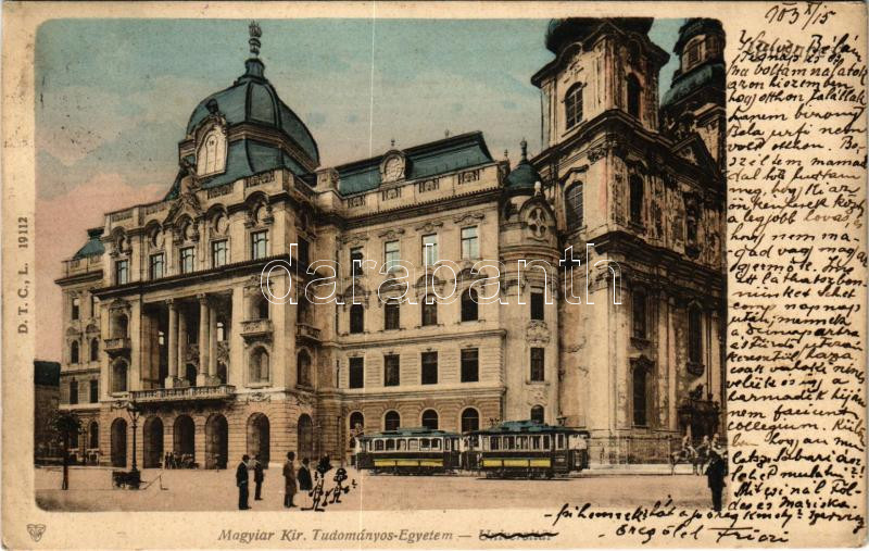 1903 Budapest V. M. kir. Tudományos Egyetem, villamos (EK) https://www.darabanth.com/hu/438-Gyorsarveres/438.0/Kepeslapok/Magyarorszag~2500005/1903-Budapest-V-M-kir-Tudomanyos-Egyetem-villamos-EK~II2864257