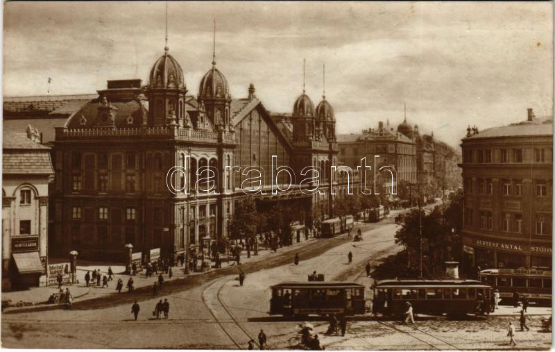 Leírás: 1927 Budapest VI. Nuygati pályaudvar, vasútállomás, villamos, Kertész Antal üzlete