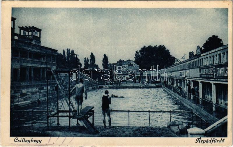 1935 Budapest III. Csillaghegy, Árpád fürdő, reklámok, kétszintes ugró... https://www.darabanth.com/hu/438-Gyorsarveres/438.0/Kepeslapok/Magyarorszag~2500005/1935-Budapest-III-Csillaghegy-Arpad-furdo-reklamok-ketszintes-ugrodeszka-Hangya-szovetk~II2865288