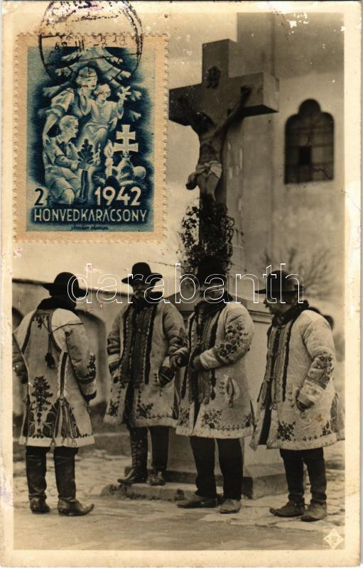 1943 Mohács, Mohácsi parasztok télen, magyar folklór (lyuk / pinhole) https://www.darabanth.com/hu/438-Gyorsarveres/438.0/Kepeslapok/Magyarorszag~2500005/1943-Mohacs-Mohacsi-parasztok-telen-magyar-folklor-lyuk-pinhole~II2865636
