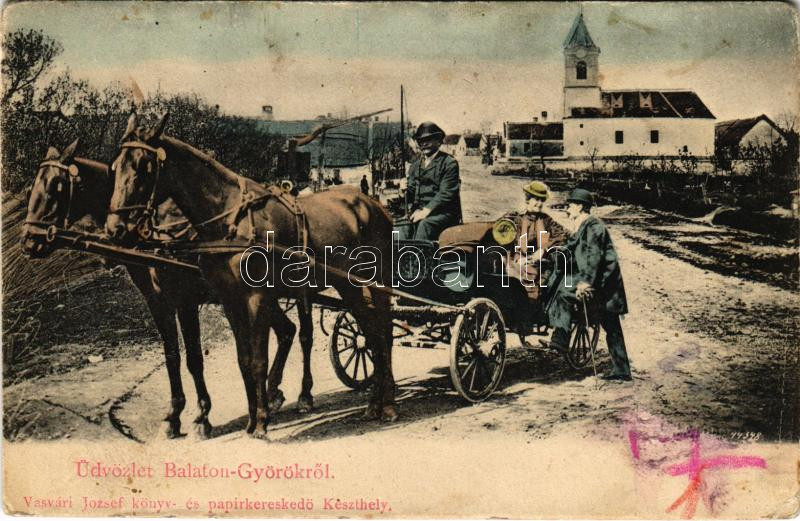 Leírás: Balatongyörök, Balaton-Györök; Fő utca, templom, lovaskocsi. Vasvári József kiadása (fl)