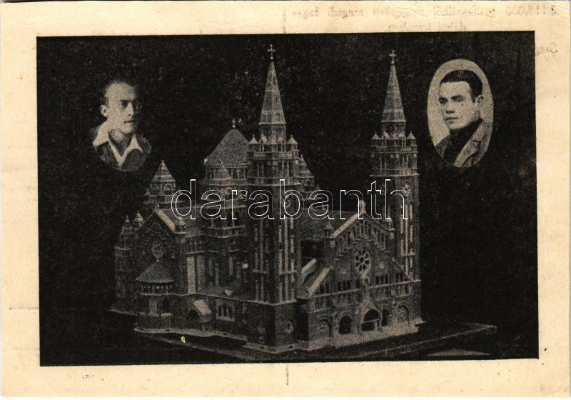 Leírás: Szeged, Fogadalmi templom 2.115.000 gyufaszálból megépítve, tervezők arcképével (vágott / cut)