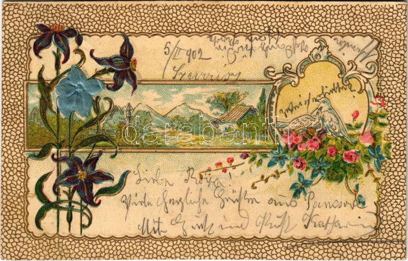 Leírás: 1902 Flowers, pigeons, art postcard. Emb. litho decorated with silk flowers