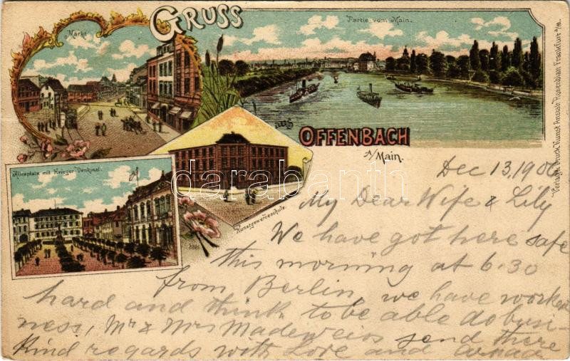 Leírás: 1906 Offenbach, Markt, Partie vom Main, Aliceplatz mit Krieger Denkmal, Kunstgewerbeschule. Kunstanstalt Rosenblatt Art Nouveau, floral, litho (Rb)