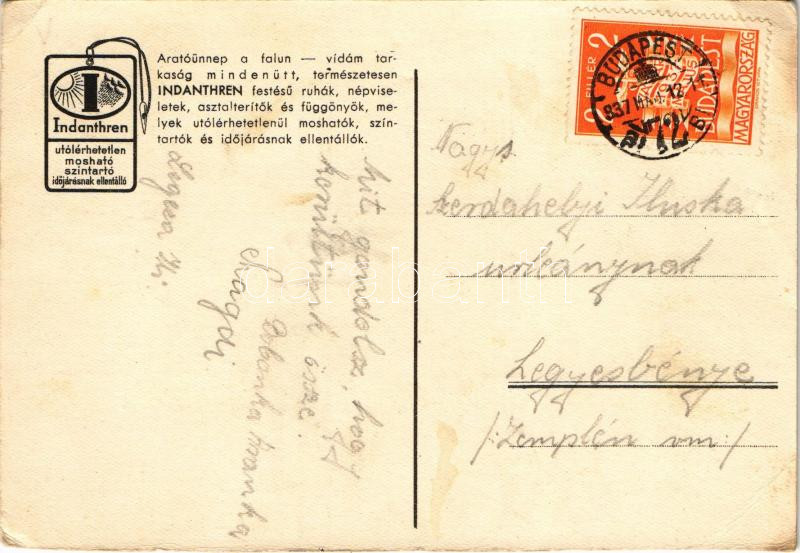 Leírás: 1937 Kávézás az aratóünnepen. Indanthren textil festék reklámlap / Hungarian folklore, Indanthren textile paint advertisement (EB)