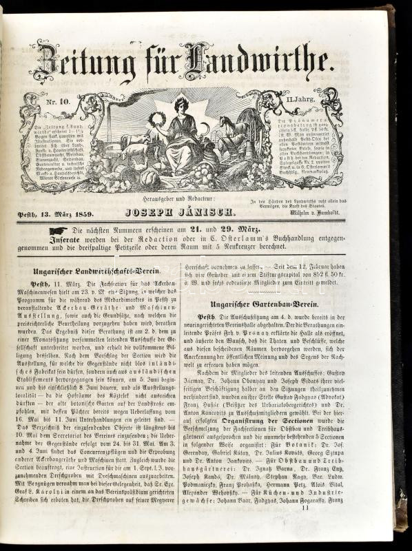 1859 Zeitung für Landwirthe. Szerk.: Joseph Janisch. II. évf. 1-46. sz. Német nyelvű folyóirat teljes évfolyama, egybekötve. Pest, 1859, Robert Boldini, VIII+496 p. Félvászon-kötésben, a borító kissé sérült, belül a lapok épek.