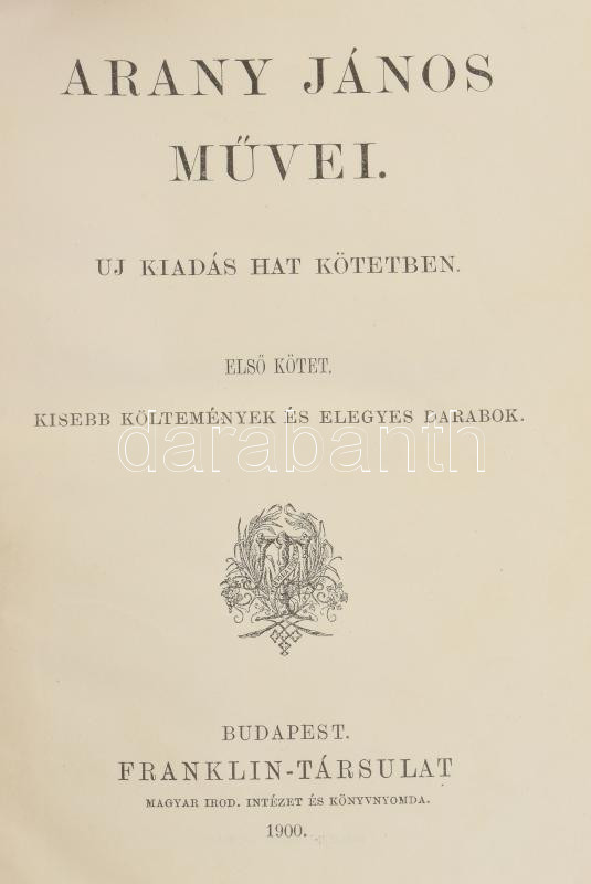 Arany János művei 1-6. köt. Uj kiadás hat kötetben. Bp., 1900., Franklin. Kiadói aranyozott, festett egészvászon-kötés, márványozott lapélekkel, a borítón kopásnyomokkal.
