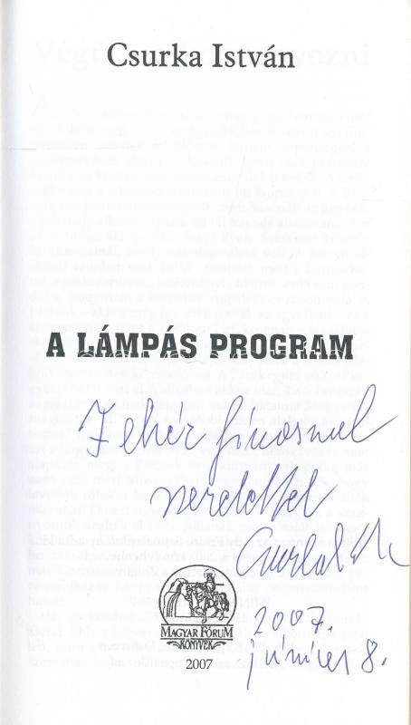 Csurka István: A lámpás program. Bp., 2007, Ady Endre Sajtóalapítvány. Kiadói papírkötés. A szerző, Csurka István (1934-2012) József Attila-díjas író, dramaturg, politikus által DEDIKÁLT példány.