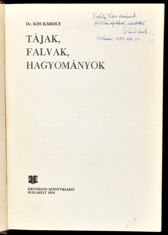 Dr. Kós Károly: Tájak, falvak, hagyományok. Bukarest, 1976, Kriterion.... https://www.darabanth.com/hu/438-Gyorsarveres/438.0/Konyvek/Konyvek-Egyeb-ritkasagok~1000027/Dr-Kos-Karoly-Tajak-falvak-hagyomanyok-Bukarest-1976-Kriterion-Fekete-feher-fotokkal-~II2865448