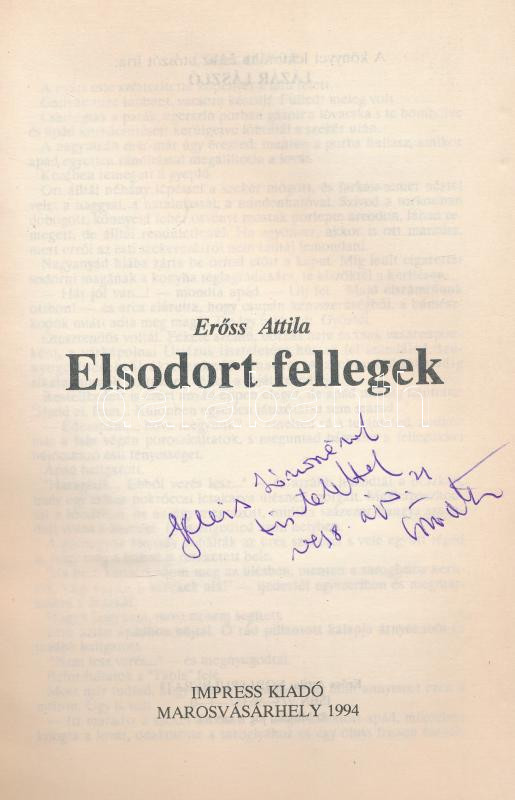 Erőss Attila: Elsodort fellegek. Marosvásárhely, 1994, Impress. Kiadói... https://www.darabanth.com/hu/438-Gyorsarveres/438.0/Konyvek/Konyvek-Egyeb-ritkasagok~1000027/Eross-Attila-Elsodort-fellegek-Marosvasarhely-1994-Impress-Kiadoi-papirkotes-kisse-kop~II2863048
