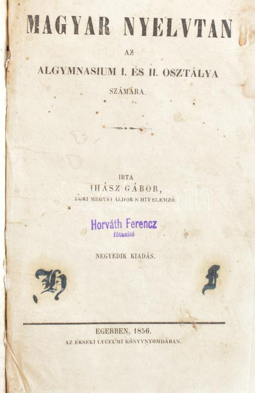 Ihász Gábor: Magyar nyelvtan az algymnasium I. és II. osztálya számára. Eger, 1856, Érseki Lyceum, 156+1 p. Negyedik kiadás. Korabeli papírkötésben, foltos lapokkal