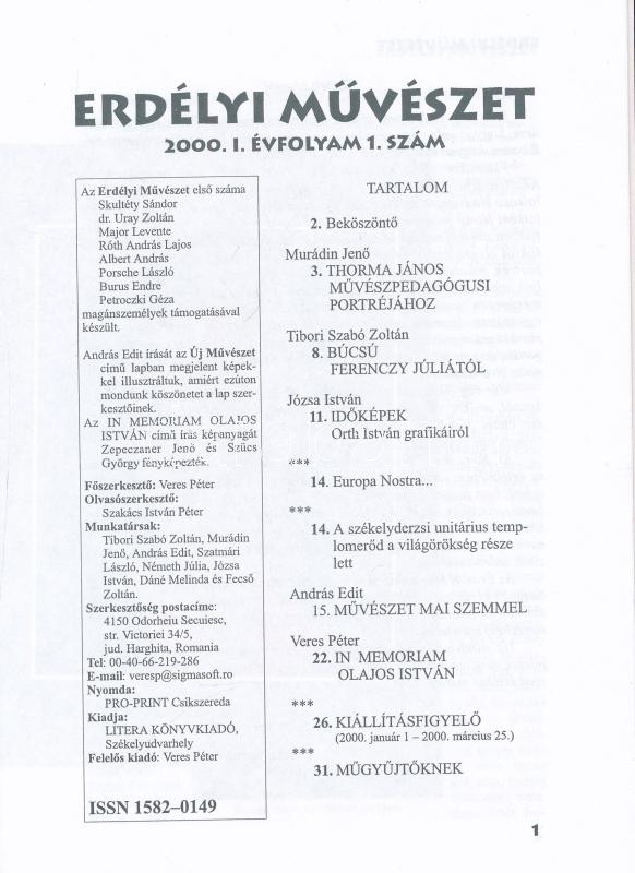 Leírás: 2000 Erdélyi Művészet. I. évf. 1. szám.