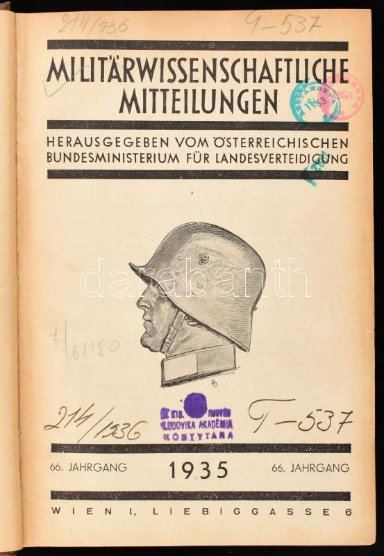 Militärwissenschatliche Mitteilungen. 66. Jahrgang. Hrsg. vom Österreichischen Budesministerium für Landesverteidigung. Wien, 1935., Österreichischen Bundesministerium, 1006 p. + 2-15 t. Német nyelven, érdekes írásokkal, közte az I. világháborúra vonatkozóval. Átkötött félvászon-kötésben, kopott borítóval, deformált gerinccel, intézményi bélyegzésekkel, egy hiányzó melléklettel.