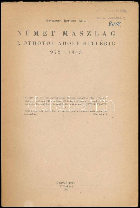 Bevilaqua Borsody Béla: Német maszlag. I. Othotól Adolf Hitlerig. 972-1945. Bp., 1945., Magyar Téka. Kiadói papÃrkötés, kopott, szakadt, kissé sérült borÃtóval, javÃtott gerinccel és kötéssel, részben felvágatlan lapokkal.