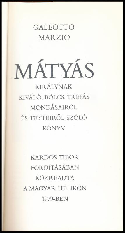 Leírás: Galeotto Marzio: Mátyás királynak kiváló, bölcs, tréfás mondásairól és tetteiről szóló könyv. Ford.: Kardos Tibor. Bp., 1979., Magyar Helikon. Kiadói papírkötés, kiadói papír védőborítóban.