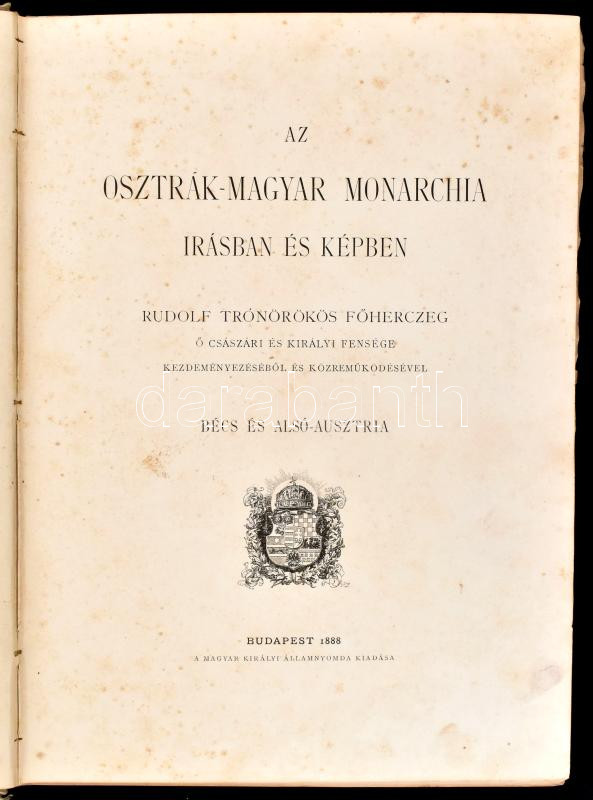 Az Osztrák-Magyar Monarchia írásban és képben II. kötet: Bécs és Alsó-Ausztria. Bp., 1888, M. Kir. Államnyomda, XVI+688 p. Gazdag egészoldalas, és szövegközti képanyaggal illusztrált. Kiadói dúsan aranyozott, festett egészvászon-kötés, Gottermayer-kötés, márványozott lapélekkel, kopott borítóval, sérült gerinccel, kissé foltos lapokkal, kijáró lapokkal és néhány kijáró lap szélén szakadásokkal, hiányzó táblákkal.