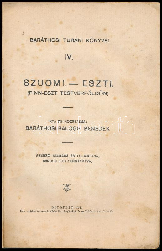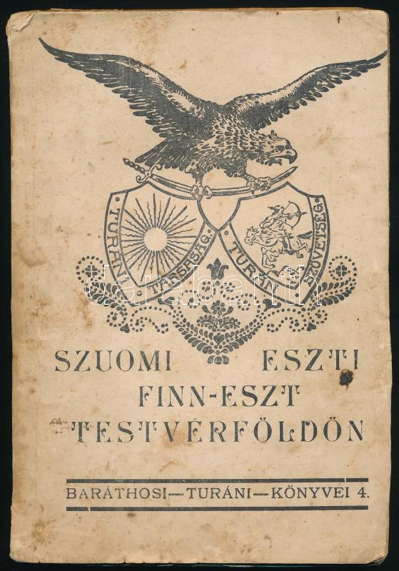Leírás: Baráthosi-Balogh Benedek: Szuomi - Eszti. (Finn-észt testvérföldön). Baráthosi Turáni Könyvei 4. Bp., 1931, szerzői kiadás, 160 p. Kiadói papírkötés, sérült, foltos borítóval, helyenként foltos lapokkal.