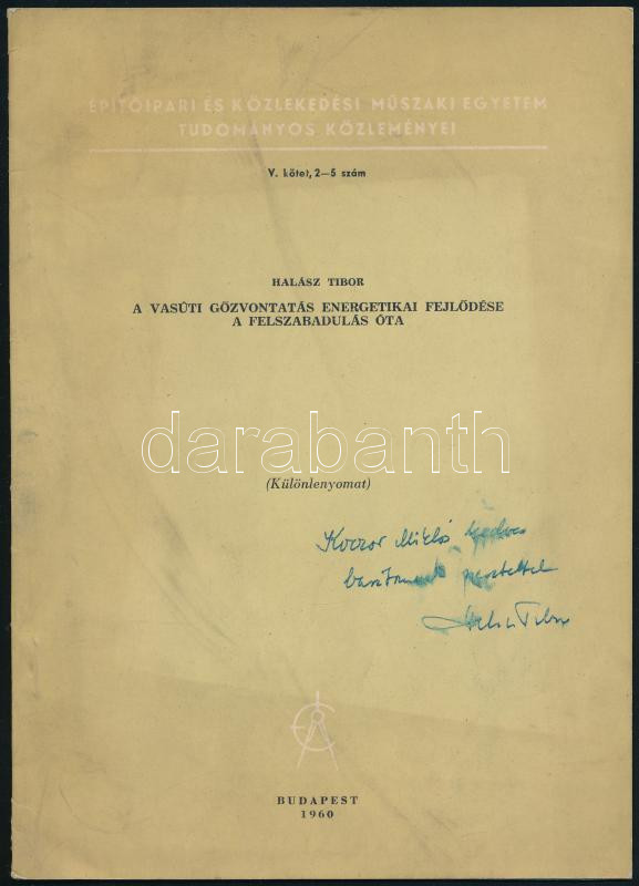 Halász Tibor: A vasúti gőzvontatás energetikai fejlődése a felszabadulás óta. (Különlenyomat). Építőipari és Közlekedési Műszaki Egyetem Tudományos Közleményei V. köt. 2-5. sz. Bp., 1960, k.n., 293-308 p. Kiadói tűzött papírkötés, kissé koszos borítóval. A szerző által DEDIKÁLT példány.