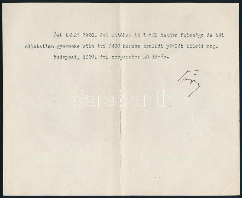 Leírás: 1920 Tőry Gusztáv (1857-1925) curiai elnök, igazságügy-miniszter aláírása hivatalos levélen