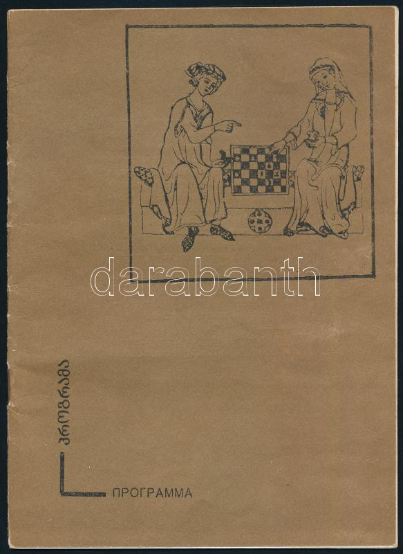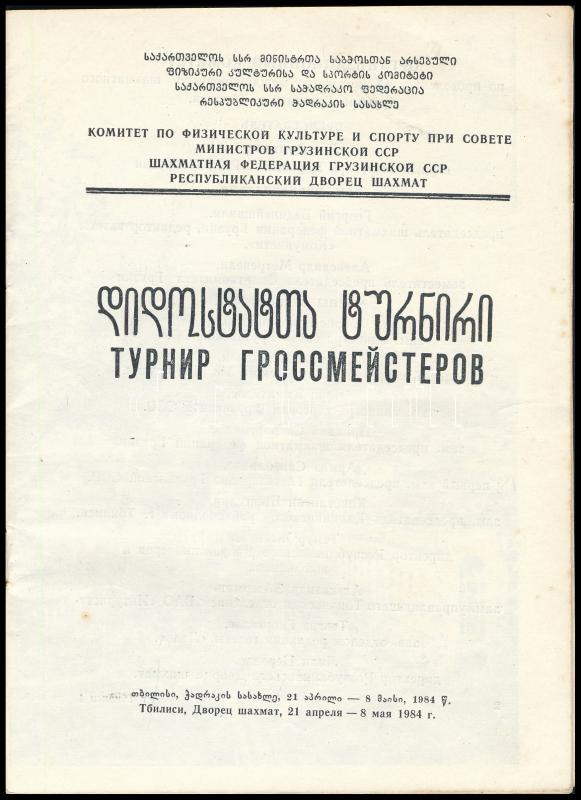 1984. évi nagymesteri torna, orosz és grúz nyelvű sakk füzet, benne női sakkozók aláírásaival (Milunka Lazarević, Marta Litinskaya, Margareta Mureşan, stb.; össz. 12 db). Fekete-fehér fotókkal. Kiadói tűzött papírkötés, 24 p. / Chess tournament booklet, with signatures of female chess players (12 in total), in Russian and Georgian language