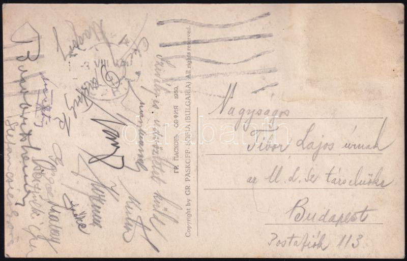 Azonosítatlan magyar landarúgócsapat tagjai által aláírt képeslap, közöttük Sárosi (Stefancsics) György (1912- 1993) az FTC labdarúgója. / Hungarian football team autograph signed postcard.