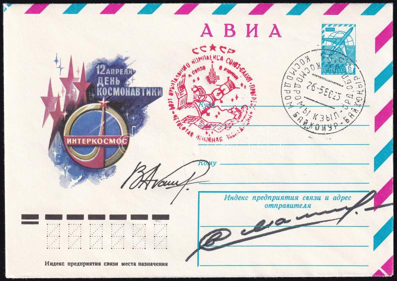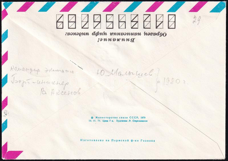 Jurij Malisev (1941-1999) és Vlagyimir Akszjonov (1935- ) szovjet űrhajósok aláírásai emlékborítékon / Signatures of Yuriy Malishev (1941-1999) and Vladimir Aksyonov (1935- ) Soviet astronauts on envelope
